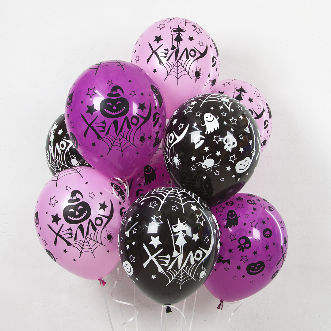 Набор воздушных шаров "Гламурный Хэллоуин" состоит из 5 дизайнов с цветной и однотонной печатью.